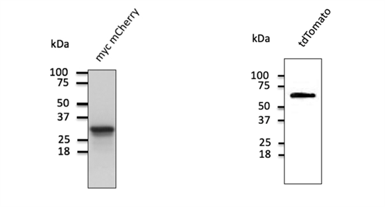? ? 西美杰代理SICGEN品牌提供的Anti-mCherry和Anti-tdTomato均為從圓盤珊瑚中提取的紅色熒光蛋白的多克隆抗體。Anti-mCherry和Anti-tdTomato兩種抗體的抗原均是大腸桿菌表達(dá)的重組多肽純化而來(lái),用Western blot檢測(cè)轉(zhuǎn)染了兩種蛋白的HEK293細(xì)胞,分別可檢測(cè)到29kda和55kda的條帶。Anti-tdTomato抗體對(duì)tdTomato和mCherry均有特異性,但與綠色熒光蛋白(GFP)不發(fā)生交叉反應(yīng)。???????????