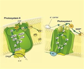 光合作用高效的吸能、傳能、轉(zhuǎn)能過程是在光合膜上具有一定分子排列空間構(gòu)象的色素蛋白復(fù)合體上進行的,并在10-15秒至10-7秒內(nèi)完成。整合于光合膜上的色素蛋白復(fù)合物根據(jù)功能通常分為:光系統(tǒng)I(PSI)、光系統(tǒng)II(PSII)、Cytb6f復(fù)合物以及ATP合成酶復(fù)合物。在這4個色素蛋白復(fù)合體共同參與下,光合作用的光反應(yīng)完成電子從H2O到NADP+的傳遞并產(chǎn)生ATP和釋放O2。PSI和PSII是生物光能轉(zhuǎn)換的重要場所,涉及水裂解放氧反應(yīng)和原初電荷分離等關(guān)鍵步驟,是決定光合作用效率的重要部位。