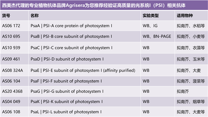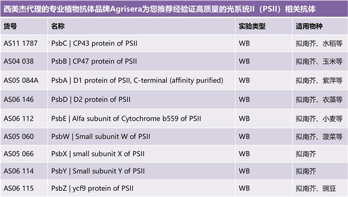 為滿足廣大光合作用研究方向客戶的需求,西美杰聯(lián)合專業(yè)抗體品牌Agrisera推出光系統(tǒng)PSI和PSII相關(guān)抗體促銷活動!活動內(nèi)容如下: