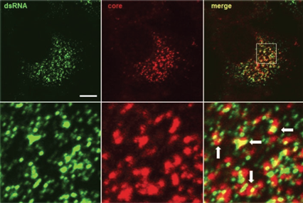 圖中展示了抗體J2(1:250稀釋, 4ug/ml)dsRNA (綠色標注)和丙型肝炎病毒核心蛋白(紅色標注)的標記位點,揭示了病毒組裝位點的位置(箭頭)。