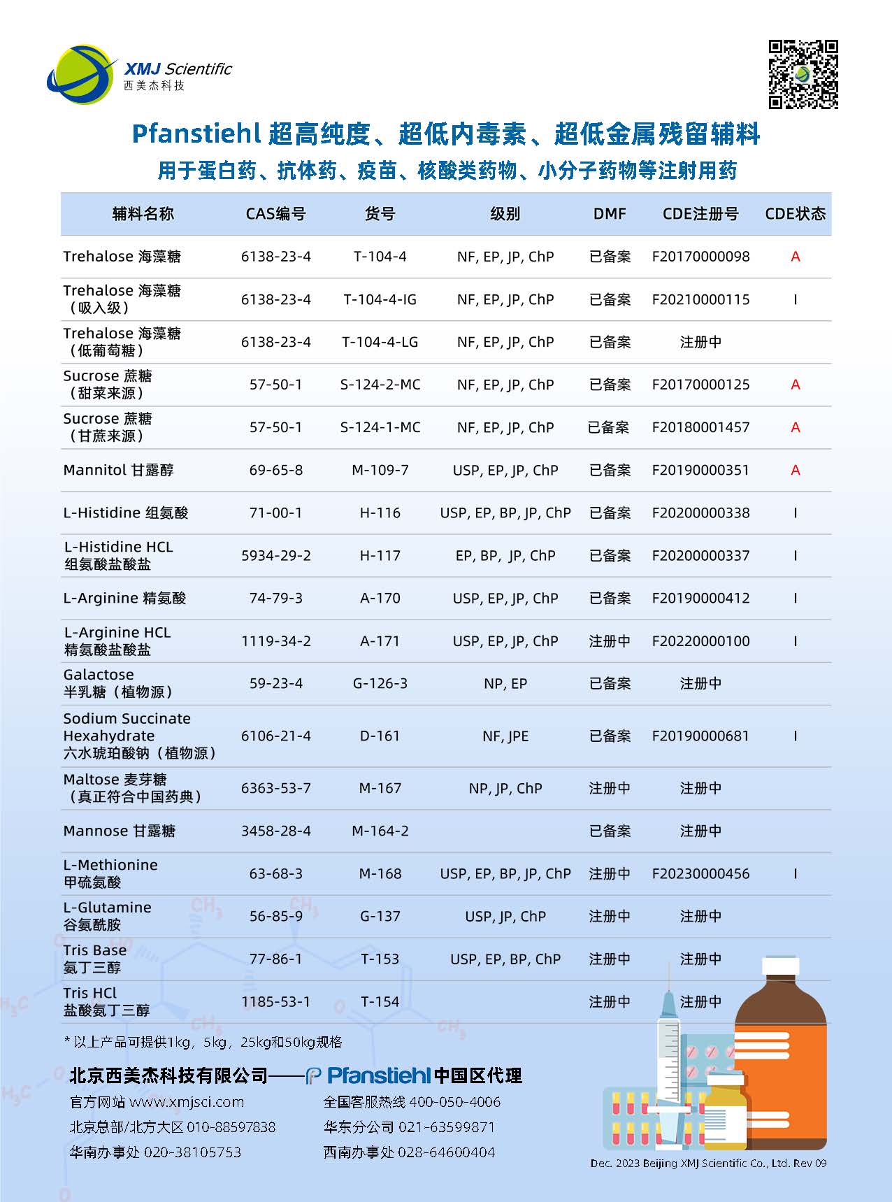 Pfanstiehl Inc.成立于1919年, 公司總部位于美國芝加哥市北郊沃吉根工業(yè)區(qū),是美國老字號企業(yè)之一,也是一家真正的cGMP生產(chǎn)商。作為一家有著百年基業(yè)和沉淀的公司,Pfanstiehl Inc立志將產(chǎn)品質(zhì)量做到極致,是全球生物制藥領(lǐng)域超純糖類、氨基酸類以及其他尖端分子的領(lǐng)先生產(chǎn)商,迄今已服務(wù)全球蛋白藥、抗體藥、疫苗、mRNA及核酸類藥物等領(lǐng)域100年以上。Pfanstiehl Inc. 超高純度、超低內(nèi)毒素,超低金屬離子含量的輔料制劑產(chǎn)品,全面的技術(shù)和法規(guī)審計支持,真正的cGMP質(zhì)量控制體系,接受FDA的定期監(jiān)察審計等都被國際知名生物制藥公司所認可。Pfanstiehl Inc.是全球超高純度、超低內(nèi)毒素、超低金屬離子含量等注射級糖類的領(lǐng)先制造商,產(chǎn)品生產(chǎn)均參照ICHQ7質(zhì)量體系。自2015年進入中國市場以來,Pfanstiehl Inc.已獲得13個 CDE登記號,主要產(chǎn)品含括海藻糖,蔗糖,D-甘露醇,組氨酸,組氨酸鹽酸,精氨酸,精氨酸鹽酸,琥珀酸鈉,甲硫氨酸等,其中海藻糖F20170000098,甘蔗源蔗糖F20180001457和甜菜源蔗糖F20170000125, D-甘露醇F20190000351的CDE號均已激活。 Pfanstiehl Inc.于2023年又重磅推出注射級Tris和Tris HCl,這將是全球高質(zhì)量的Tris和Tris HCl。作為一家有著百年歷史的企業(yè),Pfanstiehl Inc. 也在持續(xù)投資,不斷擴充產(chǎn)品管線和擴大生產(chǎn)產(chǎn)能,以滿足和支持全球生物制藥行業(yè)的快速發(fā)展,特別是更好的助力中國生物制藥的發(fā)展需求。