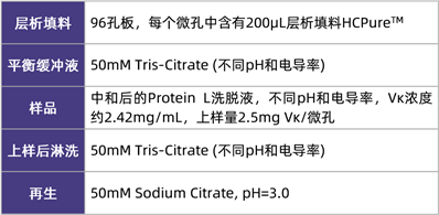 在該應(yīng)用案例中,研究人員使用大腸桿菌(E. coli )表達(dá)納米抗體Vκ,收獲液先經(jīng)過(guò)Protein L親和層析純化,洗脫液經(jīng)中和后調(diào)節(jié)成不同的pH(6.0-8.0)和電導(dǎo)率(6-18mS/cm),隨后以流穿模式上樣HCPureTM,收集流穿液和淋洗液,檢測(cè)Vκ和HCP的含量,以探究HCPureTM的最佳上樣條件。測(cè)試條件如下表所示: