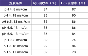 在該應(yīng)用案例中,研究人員使用CHO細(xì)胞表達(dá)IgG型單克隆抗體,澄清后的收獲液先經(jīng)過(guò)Protein A親和層析純化,洗脫液經(jīng)中和后調(diào)節(jié)成不同的pH(4.0-9.0)和電導(dǎo)率(8-18ms/cm),再以流穿模式上樣到HCPureTM中,收集流穿液和淋洗液,檢測(cè)IgG和HCP含量,其中,pH 6.0、電導(dǎo)率12ms/cm是未經(jīng)調(diào)節(jié)的親和層析洗脫中和液。