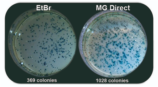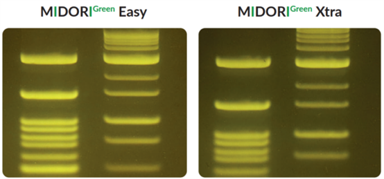 紫外光與EtBr染色至今仍一起被用于分子生物學實驗室中檢測核酸。然而紫外光譜會導致DNA樣品的修飾和降解,30秒的紫外線曝光足以大幅降低克隆效率。藍/綠LED在470 nm - 520 nm處發(fā)出安全可見光,這種光譜對 DNA 沒有破壞性,與紫外光相比,DNA完整性和克隆/測序效率完全不受影響,即使在長時間的光照下也是如此。MIDORIGreen系列核酸染料經(jīng)過優(yōu)化,可在紫外光或藍/綠光激發(fā)時獲得更亮的信號,同時也兼容紫外光。