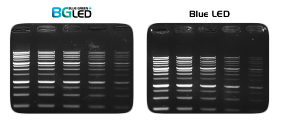 圖3:使用MIDORI Green Xtra檢測的DNA條帶具有超高靈敏度(注:左圖使用藍色/綠色 LED 透射儀進行檢測;右圖使用藍色LED透射儀進行檢測。)