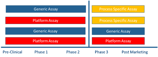美國藥典USP<1132>和歐洲藥典EP2.6.34. HOST-CELL PROTEIN ASSAYS將HCPs檢測(cè)方法分為:商業(yè)化試劑盒、產(chǎn)品/工藝專屬性方法和平臺(tái)化方法。并指出在產(chǎn)品開發(fā)的不同階段,推薦采用不同的ELISA試劑盒用于HCPs的檢測(cè)。