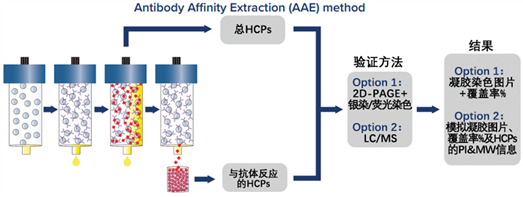AAE分析流程首先將多克隆抗體共價(jià)固定在色譜柱上。然后對(duì)色譜柱進(jìn)行條件調(diào)節(jié),以防止抗體的顯著浸出并極大地減少任何非特異性結(jié)合。原始未變性的HCPs樣品通過色譜柱與抗體進(jìn)行結(jié)合,隨后用酸洗脫。通過結(jié)合和洗脫,HCPs樣品再次在柱上循環(huán),直到?jīng)]有其他HCPs被結(jié)合。所有收集的HCPs洗脫液再匯集、交換緩沖液并濃縮回原始樣品體積,為后續(xù)的分析提供高質(zhì)量的樣本。在收集到HCPs樣本后,可以選擇通過2D-PAGE+銀染或MS質(zhì)譜進(jìn)行后續(xù)分析。
