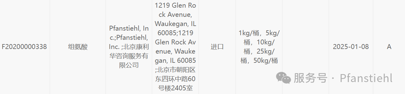 “ 熱烈祝賀Pfanstiehl品牌注射級(jí)組氨酸H-116 CDE注冊(cè)登記號(hào)F20200000338已激活!”