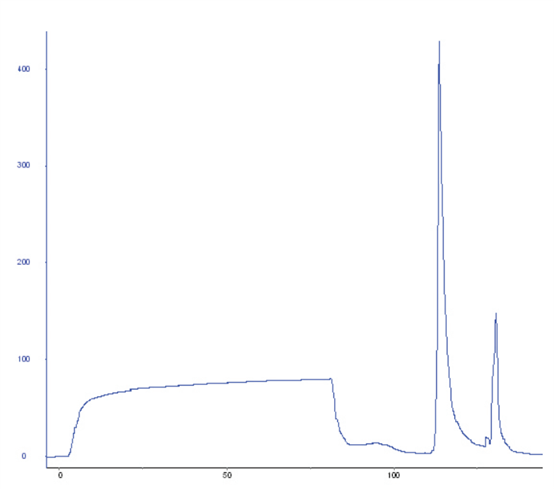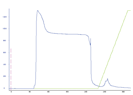 APB層析填料特別適用于糖蛋白的捕獲和純化。下圖展示了一個經(jīng)典的親和純化色譜圖,其中有一個大的流穿和一個小的離散洗脫峰。在50 mM山梨醇洗脫后達到完全的目標糖蛋白回收。