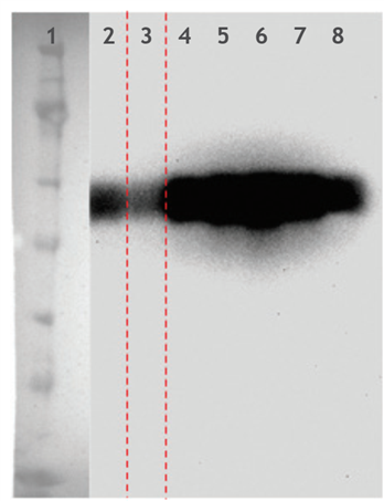 APB A6XL純化的糖蛋白Western blot結果圖(泳道1 分子量marker,泳道2 上樣到APB A6XL的樣品,泳道3 流穿液,泳道4-8 梯度洗脫液)