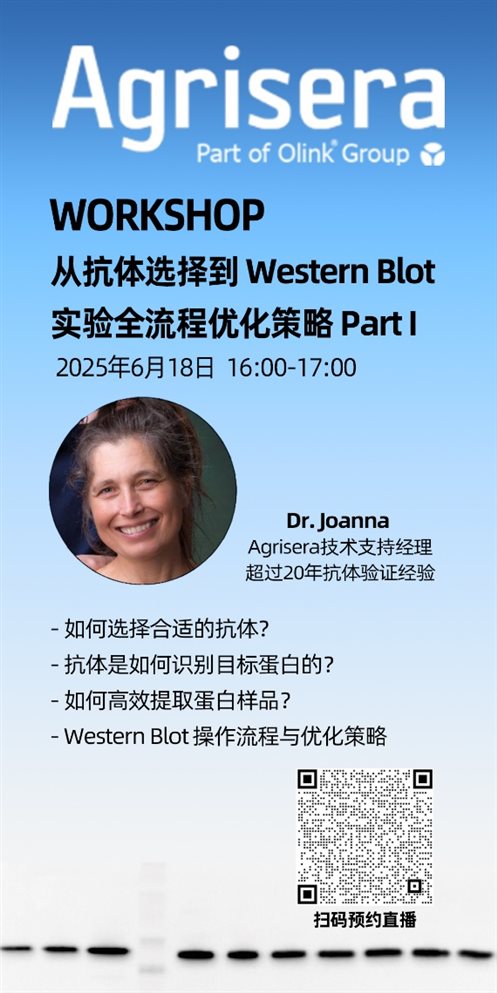 Western Blot實驗效率與結(jié)果的可靠性,很大程度上取決于對抗體特性的理解、正確的選擇以及實驗流程的優(yōu)化。為解決WB實驗過程中的常見問題,Agrisera技術(shù)專家Joanna博士將為大家?guī)?/span>WB全流程優(yōu)化系列講座,本系列講座包含兩次線上直播課程,6月18日下午4點直播第一次課程:從抗體選擇到WB全流程優(yōu)化策略,深度解析Western Blot技術(shù)的關(guān)鍵環(huán)節(jié),為您提供專業(yè)的優(yōu)化方案,歡迎大家提前報名預(yù)約。