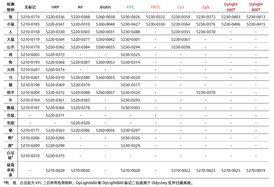 - 種屬齊全:KPL 的二抗覆蓋20 多個(gè)物種,主要種屬有:人、兔、小鼠、大鼠、山羊、綿羊、馬、牛、猴、豬、貓、雞、豚鼠、倉鼠等,其中特殊物種二抗有鴨、鹿和白足鼠。