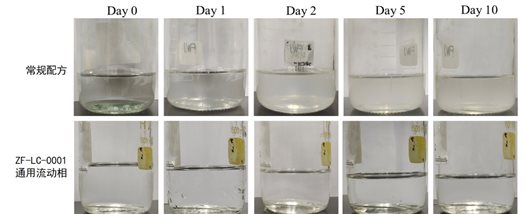 The mobile phase without Zhoufan Biology's proprietary formula used in this experiment was prepared in accordance with conventional formulations. The control group mobile phase and ZF-LC-0001 mobile phase (1×) were respectively filled into clean and transparent 1L mobile phase bottles. Photos were taken for sample retention on days 0, 1, 2, 5, and 10, and the recorded images are shown in Figure 1. Compared with the control group mobile phase, the ZF-LC-0001 mobile phase exhibited excellent bacteriostatic efficacy. The results showed that visible foreign substances appeared in the control group mobile phase on the 1st day, and the phenomenon worsened on the 2nd day. The samples taken on the 5th day and the 10th day showed similar states when photographed. In contrast, the ZF-LC-0001 mobile phase remained clear and transparent until the 10th day. The mobile phases retained during this sampling period were used for the subsequent experimental analysis.