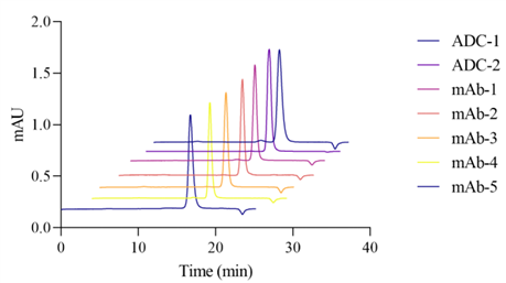 Size exclusion chromatography (SEC) analysis was performed on 5 monoclonal antibodies (mAbs) and 2 antibody-drug conjugates (ADCs) using ZF-LC-0001. All 7 protein drugs were diluted to 1 mg/mL with pure water and injected uniformly. The results, as shown in Figure 4, indicate that the ZF-LC-0001 mobile phase can achieve universal analytical effects both in common monoclonal antibody drugs and antibody-drug conjugates with strong hydrophobicity. Moreover, for low-concentration injections, protein aggregates and monomers still exhibit excellent resolution.